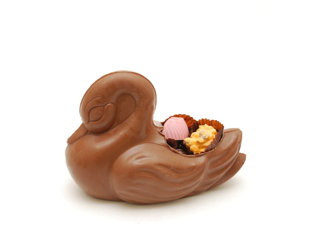 Mix čokoládových bonbonů uložených v hnědých pergamenových košíčcích v čokoládové labuti, baleno v celofánu a ovázáno stuhou.