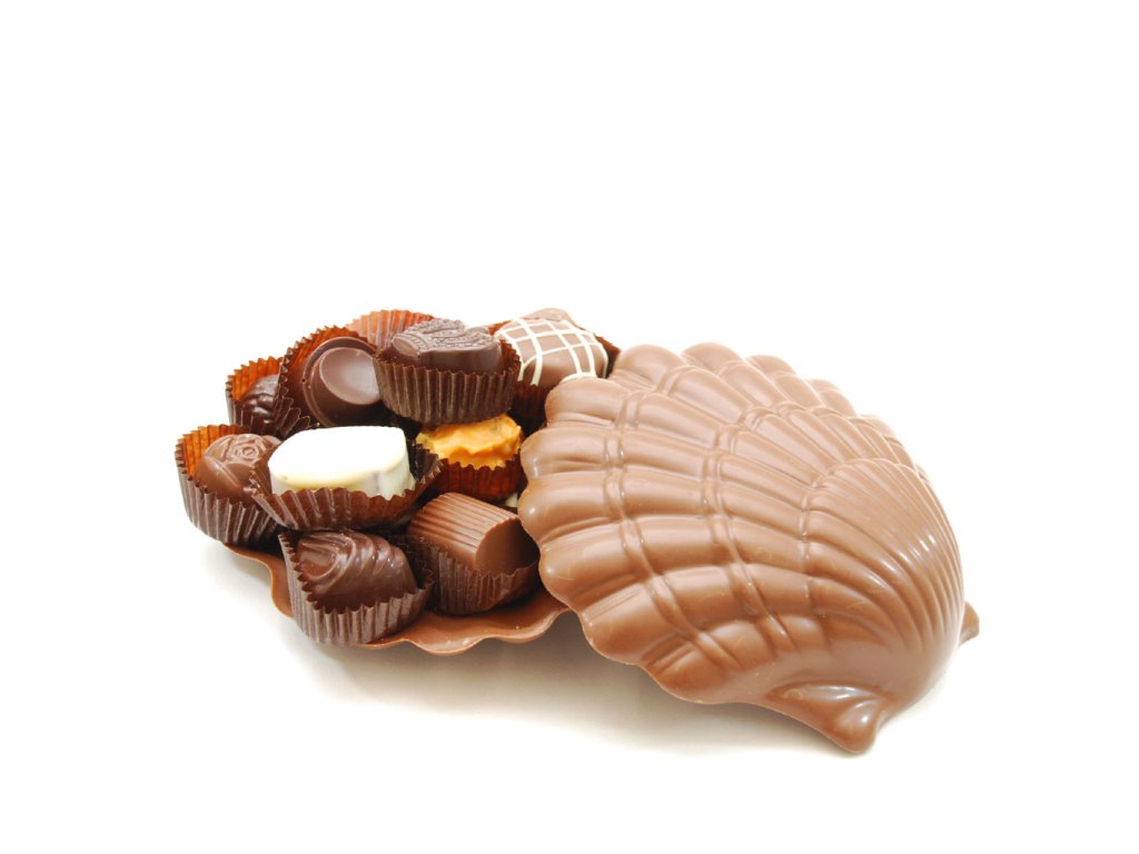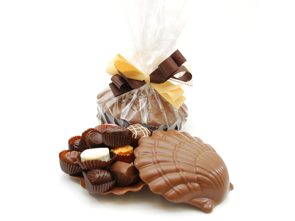 Mix čokoládových bonbonů uložených v hnědých pergamenových košíčcích v čokoládové mušli, baleno v celofánu a ovázáno stuhou.