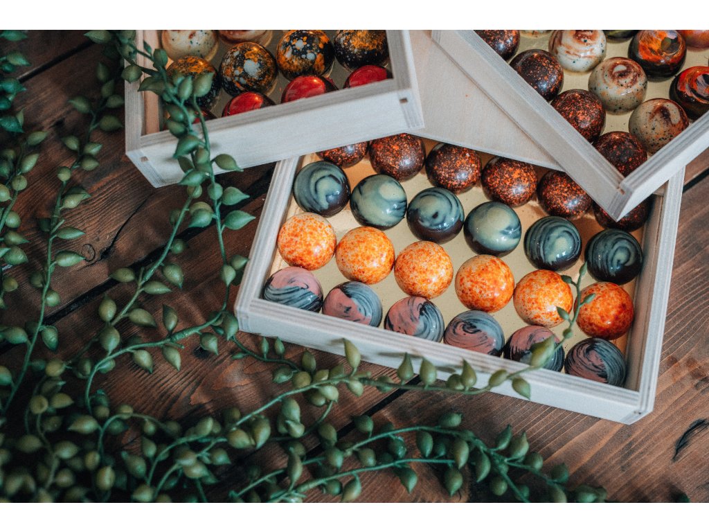 Mix čokoládových půlkuliček z mixem náplní v dřevěné krabičce s logem „Kamila Chocolates“.