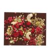 Tabulka z hořké čokolády zdobená malinami, kešu oříšky a pistáciemi. Uloženo do průhledného PVC blistru s logem Kamila Chocolates, následně uloženo do papírové krabičky.